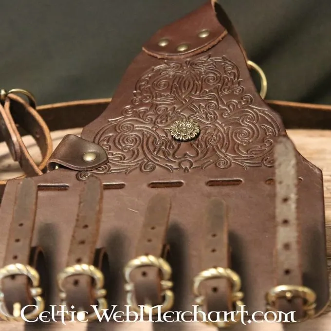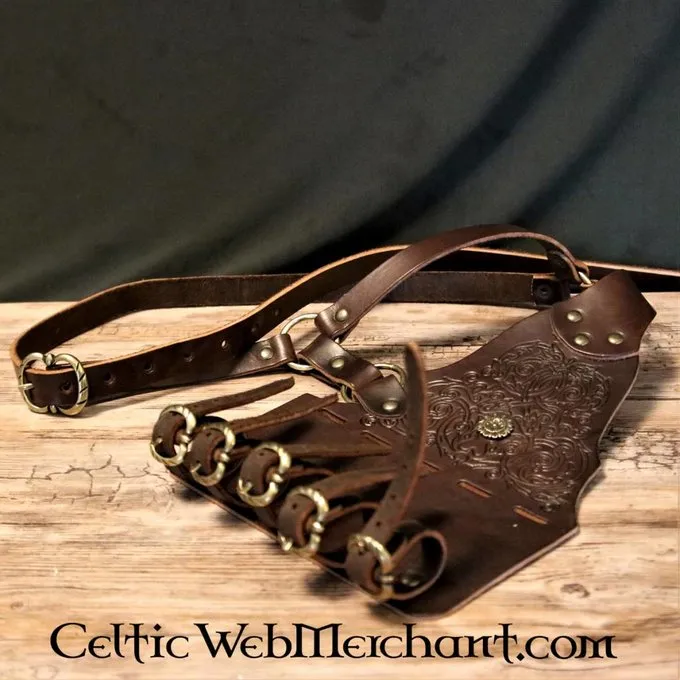 Ce baldric est une réplique d’originaux représentée sur les peintures hollandaises du 16ème au 17ème siècle. Baldrics était porté à la fois autour des épaules et autour de la taille. Ce baldric est conçu pour porter autour de la taille. Il est en cuir de haute qualité et décoré d’un motif souvent utilisé à la fin des XVIe et XVIIe siècles. Ce baldric peut facilement être ajusté à la taille de la fourreau ou du fourreau de l’épée.