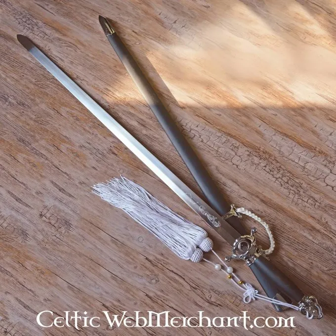 Cette épée de Tai Chi a une lame en acier inoxydable. Il est de 94 cm de long, avec une lame de 73 cm et pèse 450 grammes. Cette épée est livré avec une gaine vicié élégant.