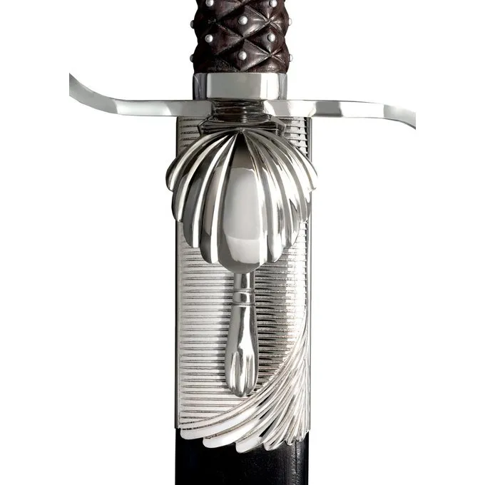 L’épée de chasse est une arme avec une lame jusqu’à 65 cm qui est devenu très populaire en Europe et aux États-Unis au cours des 16e et 17e siècles. Ce fut une déclaration de mode, mais aussi efficace, pratique et la bonne taille à prendre partout. Cette réplique de Cold Steel a une lame très polie et plusieurs foulons. La belle poignée est en bois de Malaisie et est décoré avec des épingles de nickel. La gaine et la plaque de déflecteur ont une conception en forme de coque élégante. La gaine est faite de cuir noir de haute qualité.