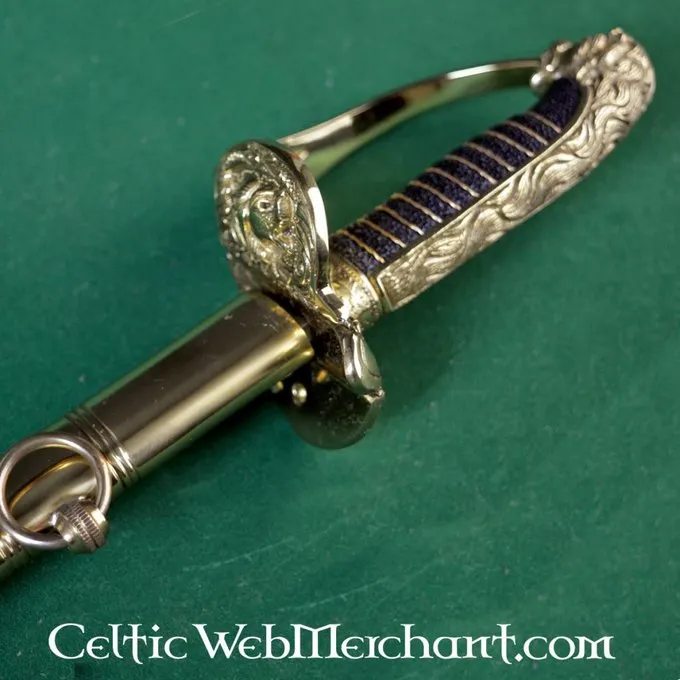 La prise en main est recouvert de cuir noir et ensuite ronde avec fil de laiton emballé. Il est décoré avec un lion britannique, également en laiton. La lame courbe est décoré. L’épée est en acier au carbone 1055. Le sabre a une longueur de 92 cm avec une lame de 81 cm. Il est livrée avec un fourreau et pèse environ. 703 g.