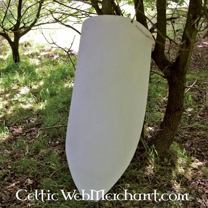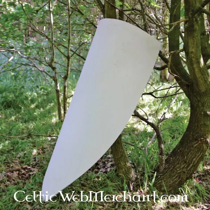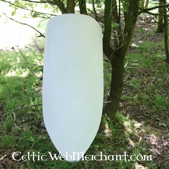 Ce bouclier est en contreplaqué. Il est recouvert d’une couche de lin blanc non peint afin qu’il puisse être peint comme vous le souhaitez. Il mesure 118 x 77 cm pour une largeur intérieure de 58 cm et un rayon de courbure de 22 cm.