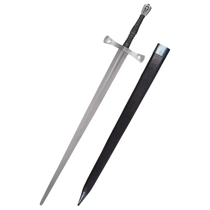 Cette épée est une réplique basée sur les originaux utilisés lors de la bataille de Tewkesbury. Cette épée et demie, ou épée bâtarde, est fabriquée en acier à ressort EN45 trempé. Le pommeau est vissé et la poignée est constituée d’un noyau en bois recouvert de cuir noir. Il a une garde croisée avec des motifs en forme de croix et un pommeau à bouchon odorant, également avec un motif en croix. La traverse a environ 23 cm de long et 0,5 cm d’épaisseur. L’épée est livrée avec un fourreau en bois recouvert de cuir noir. Le fourreau a des pointes en acier.