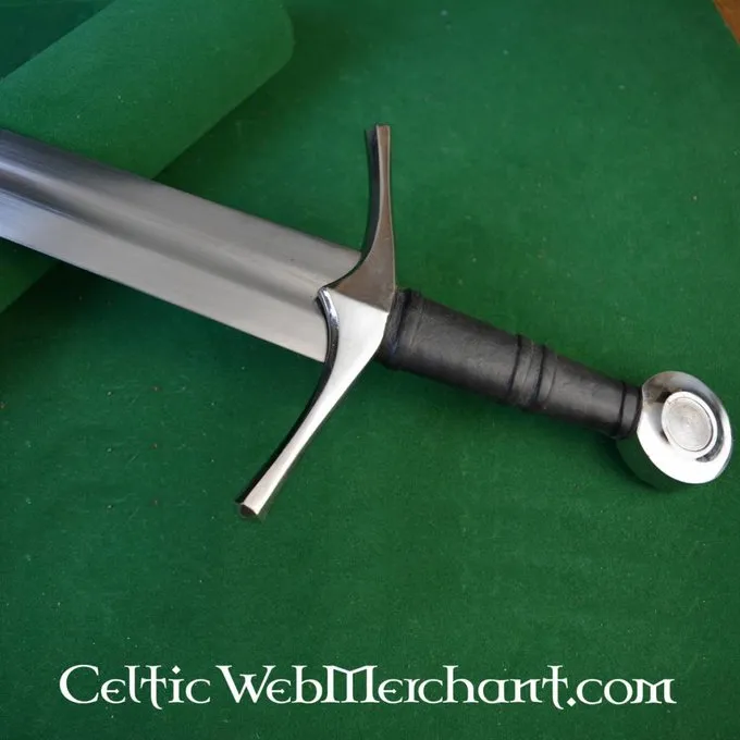 Cette épée solitaire a une longueur d’env. 90 cm et une lame de 72 cm et un maximum. largeur de 5 cm. Le pommeau décoré simple et la croix-garde étaient typiques de leur époque. La croix-garde est légèrement plié à parer ennemies. La poignée en bois est recouverte de cuir pour une bonne prise en main.