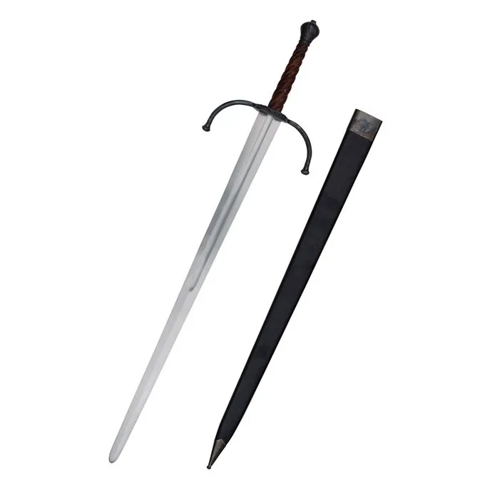 Cette belle épée est basée sur des originaux des XIVe et XVe siècles. Ce type d’épée à deux mains était également appelé épée longue ou épée bâtarde. L’épée a une poignée en bois élégante qui fonctionne dans un motif en spirale. Le bois est traditionnellement coupé et poli. Un détail spécial est que le motif en forme de spirale peut également être vu sur le pommeau, mais dans l’ordre inverse, cela forme un beau contraste visuel. Le garde a un anneau de parade tordu. L’épée est livrée avec un fourreau en cuir avec un noyau en bois. Le fourreau a des chapes en acier.