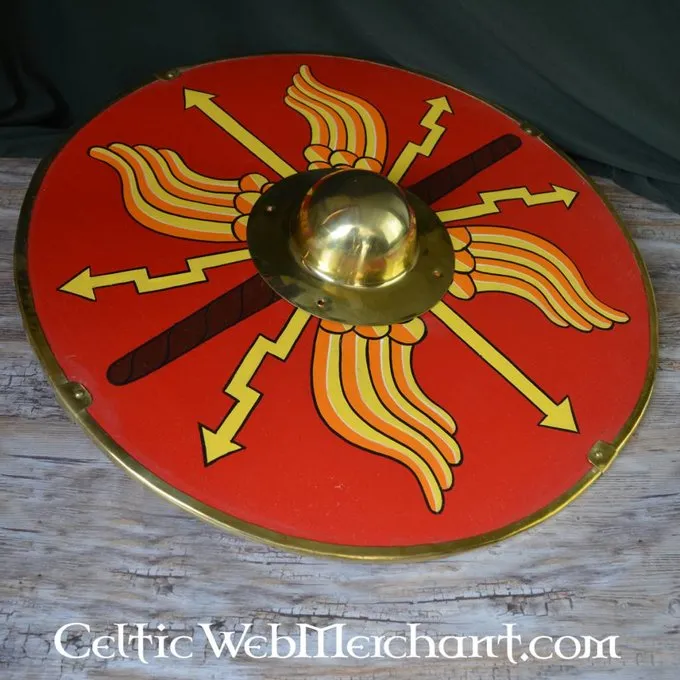 Le parma romain était le bouclier utilisé par auxiliae romain, musiciens et signiferi. Ce bouclier ovale est peint en rouge dans les couleurs du dieu de la guerre Mars. Elle est munie d’une poignée en bois derrière l’ombilic. Le bouclier est fait de 1 cm d’épaisseur multiplex, tout comme l’original. Il est recouvert de lin.