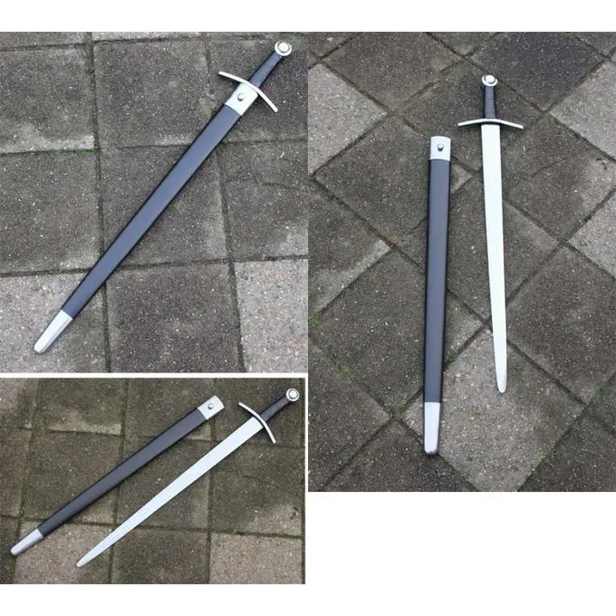 Détails de produit: Longueur: 91 cm / Longueur de lame: 76 cm / Longueur de poignée: 15 cm / Poids: 1720 g / Type d’acier de la lame: EN45 acier au caros, dureté 48 HRC / Tranchant afilé: émoussé (3 mm, battle-ready) / Soie: soie complète / Pommeau: vissé