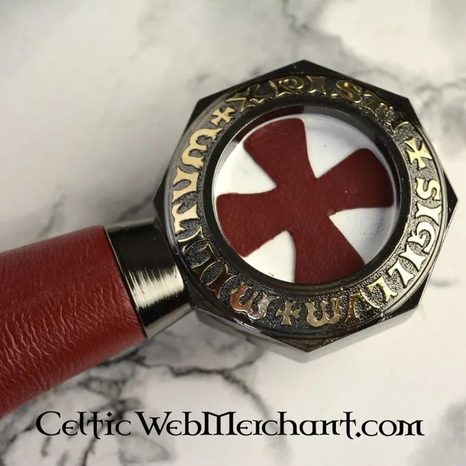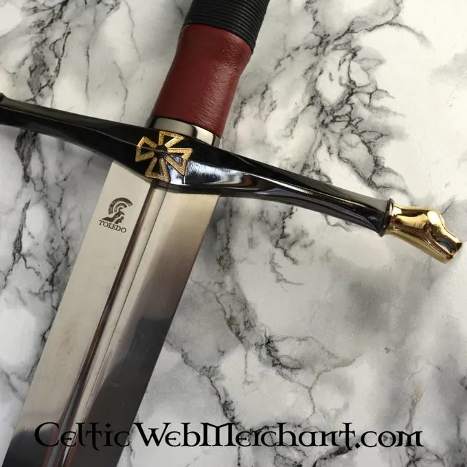 Cette épée templière est en acier Toledo. Sa longueur est de 107 cm et elle est richement décorée. Il a un beau pommeau ouvert qui lui donne un aspect puissant mais élégant. Les extrémités des gardes croisés ont des têtes de lion.