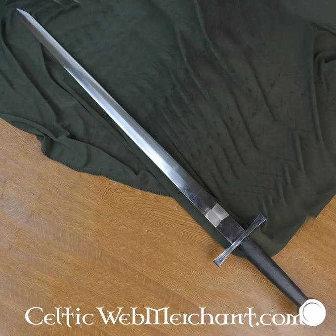L’acier doux de l’épée est faite d’un morceau de métal pour la sécurité, la solidité et le confort. La poignée en bois est recouvert de cuir. La longueur de la lame d’une seule main est 97,5 cm avec une largeur de lame maximale d’env. 3,7 cm. La longueur de la lame est de 77 cm.
