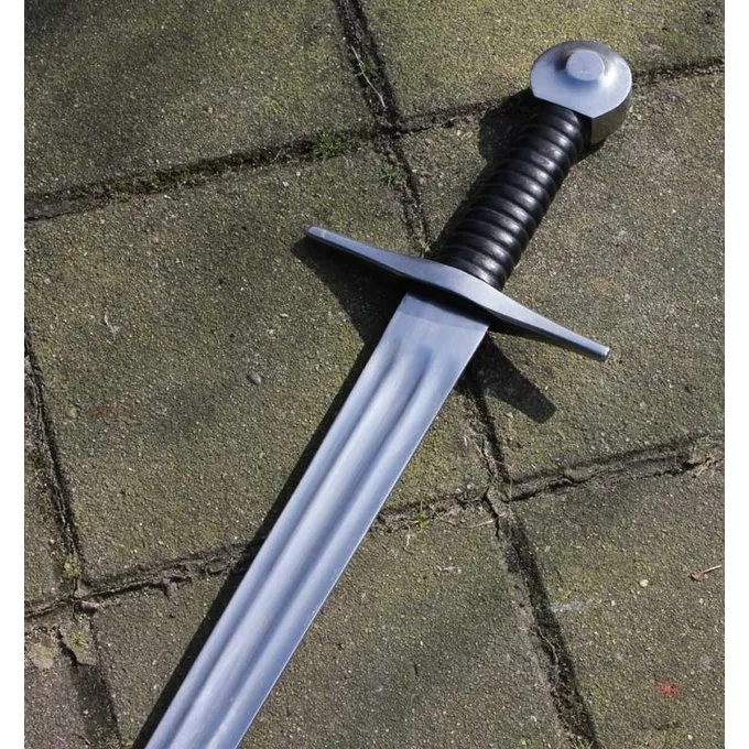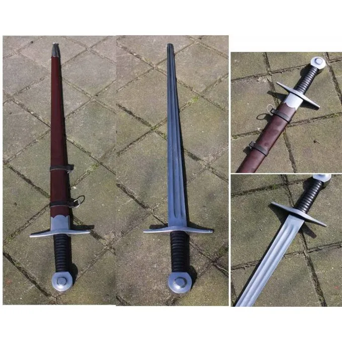 Cette longue épée 93 cm est basée sur l’épée marshall qui était basée sur les chevaliers les plus fidèles d’Henri II, Richard Coeur de Lion et Jean sans Terre. Le 76 cm de long lame a pas de bords coupants ou la pointe et a trois foulons pour l’équilibre supplémentaire, donc l’épée Marshall est parfait pour reconstitution. La lame a un max. largeur de 4,5 cm et le bord arrondi est de 2,5 à 3 mm. La poignée en bois est recouvert de cuir et est fait inégale pour une adhérence optimale. Le fourreau inclus est faite de fibre de verre, qui offre robustesse et une protection supplémentaire contre la rouille. Il dispose de deux bandes de cuir pour la fixation et est décoré avec du métal. Le poids total est de 950 g.