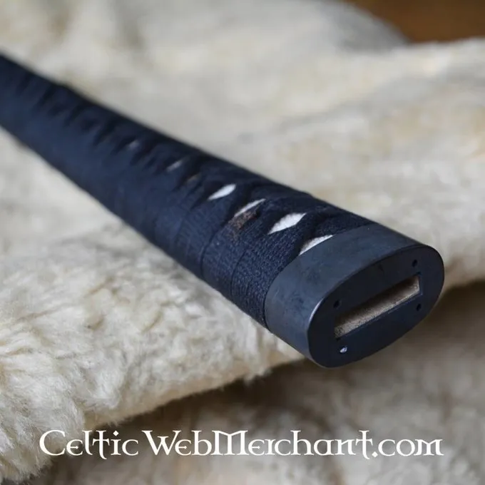 La poignée se compose de Fuchi, Menuki, Kashira et enveloppement de coton noir. Cette poignée contient de la vraie peau de rayons et est d’environ 30 cm de long.