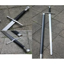 Cette épée a été développée par Gus Garni pour les armes de Kingston. Cette épée est basée sur des originaux historiques fabriqués entre les 13e et les premiers 14ème siècles. Avec le développement de l’armure d’assiette de cette époque, les épées ont développé une forme plus pointue pour poignarder des taches plus faibles. Cette épée a une lame en acier à ressort 9260. Le pommeau est glacé, ce qui signifie que la construction de Tang traverse le pommeau et est rivé au sommet.