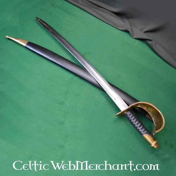 Détails de produit: Longueur: 77 cm / Longueur de lame: 61 cm / Type d’acier de la lame: EN45 acier au caros, dureté 48 HRC / Tranchant afilé: semi-tranchant / Soie: soie complète / Pommeau: vissé / Recouvrement de la poignée: laiton, bois, cuir / Basé su