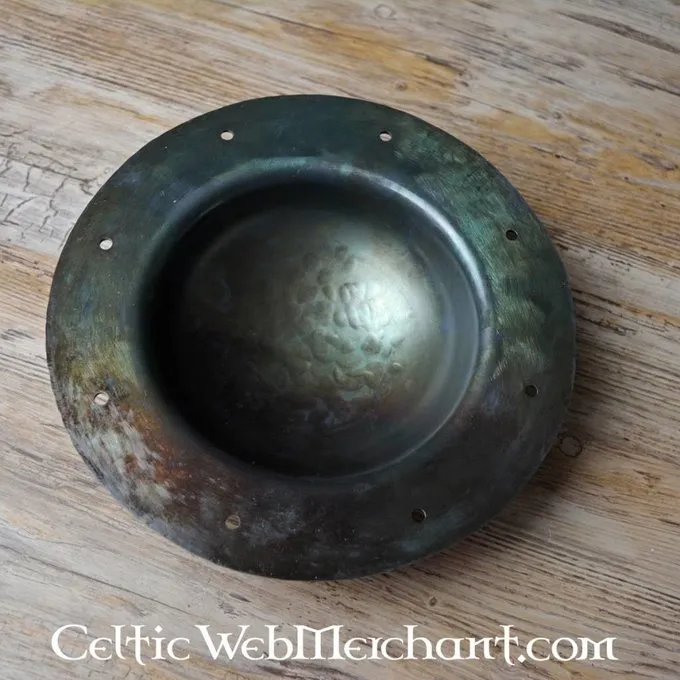 Ce boss bouclier rond est battu à la main. Il est en acier de 2 mm d’épaisseur et a un diamètre de 20 cm. Le diamètre intérieur est de 13,5 cm.
